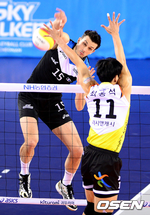 27일 오후 천안 유관순체육관에서 열린 '2012-2013 NH농협 V-리그' 남자부 현대캐피탈과 러시앤캐시의 경기, 2세트 현대캐피탈 가스파리니가 러시앤캐시 최홍석을 앞에두고 스파이크를 때리고 있다.
