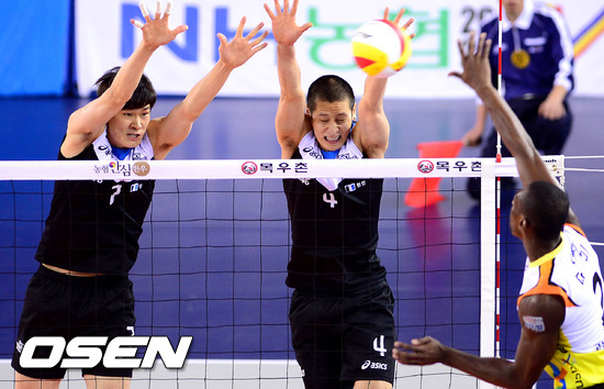 27일 오후 천안 유관순체육관에서 열린 '2012-2013 NH농협 V-리그' 남자부 현대캐피탈과 러시앤캐시의 경기, 1세트 현대캐피탈 문성민과 이선규가 러시앤캐시 다미의 스파이크를 블로킹으로 막아내고 있다.