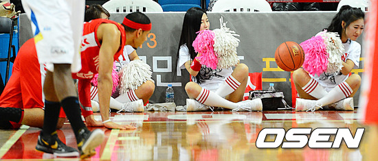 28일 저녁 울산 중구 남외동 동천체육관에서 열린 KB 국민카드 2012-2013 프로농구 울산 모비스 피버스와 서울 삼성 썬더스의 경기, 3쿼터 모비스 문태영이 놓친볼에 모비스 치어리더가 맞고 있다.