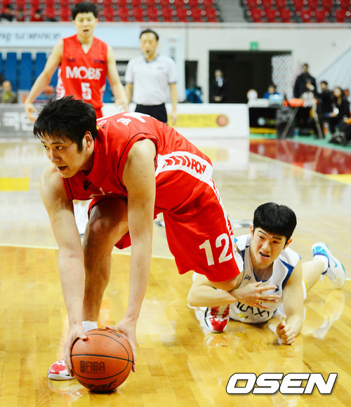 4쿼터 모비스 함지훈이 돌파를 시도할때 삼성 박병우가 넘어지며 다리를 팔로 감고 있다. / rumi@osen.co.kr