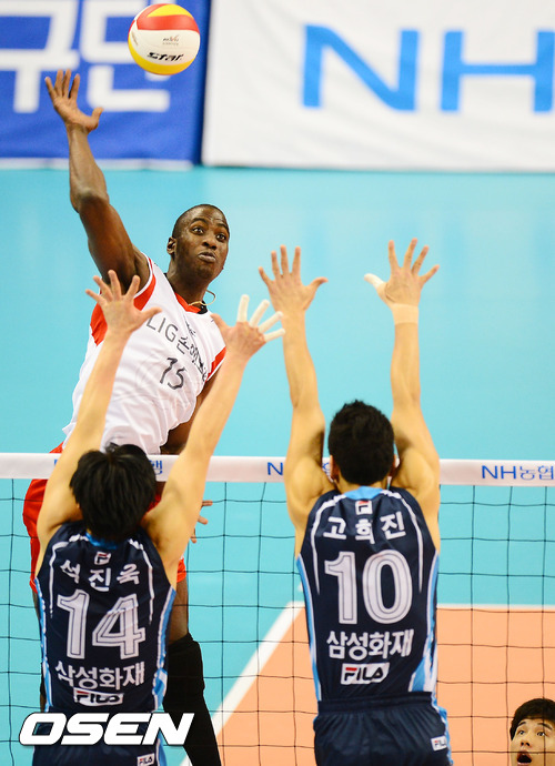 LIG 까메호가 삼성화재 석진욱 고희진의 블로킹을 피해 강타를 날리고 있다.