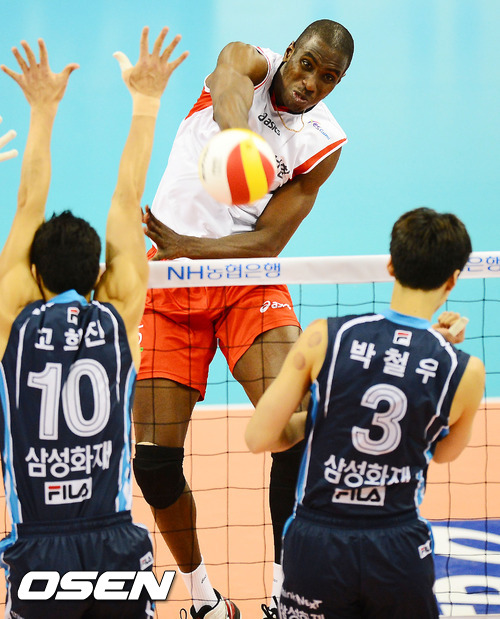 LIG 까메호가 삼성화재 고희진과 박철우의 블로킹을 피해 강타를 날리고 있다.