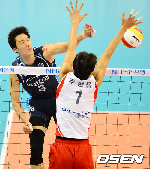 삼성화재 박철우가 LIG 주상용의 블로킹을 피해 강타를 날리고 있다. . / rumi@osen.co.kr