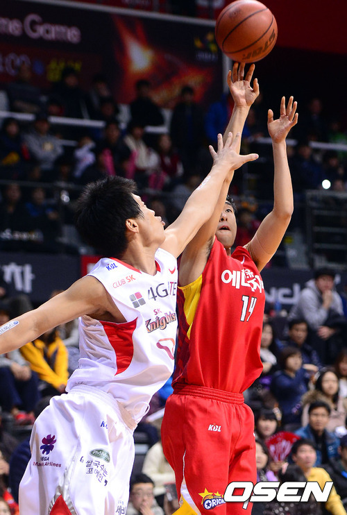 29일 오후 경기 고양체육관에서 열린 'KB 국민카드 2012-2013 프로농구' 고양 오리온스와 서울 SK의 경기, 1쿼터 오리온스 김종범이 SK 박상오의 슛블록을 피해 점프슛을 시도하고 있다.