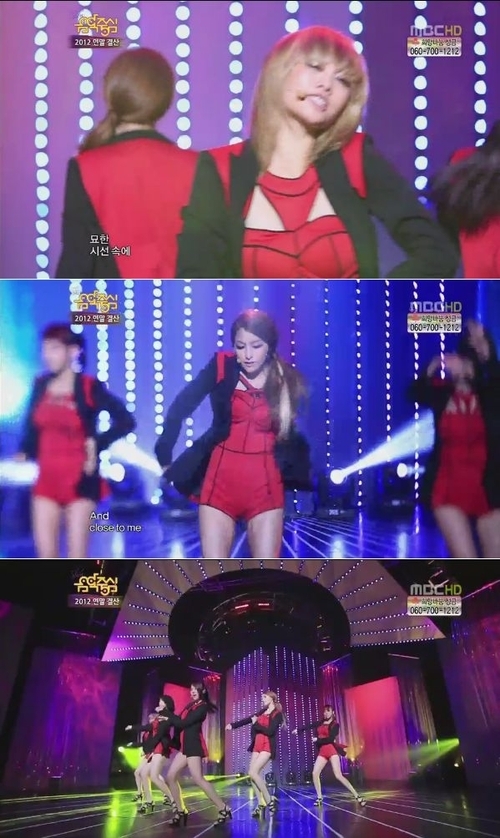 한편 '2012년 연말결산'으로 꾸며진 '쇼!음악중심'에는 B.A.P, 에일리, 소녀시대-태티서, 양요섭, 가인, 비스트, 한승연, 씨스타, 보이프렌드, 슈퍼주니어, 틴탑, 보아, 동방신기, 카라, 시크릿이 출연해 여느 때보다 더욱 화려한 무대를 꾸몄다.
