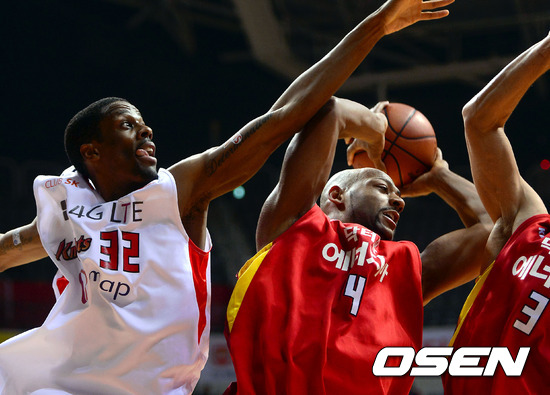 29일 오후 경기 고양체육관에서 열린 'KB 국민카드 2012-2013 프로농구' 고양 오리온스와 서울 SK의 경기, 3쿼터 오리온스 윌리엄스가 SK 헤인즈에 앞서 리바운드를 따내고 있다.