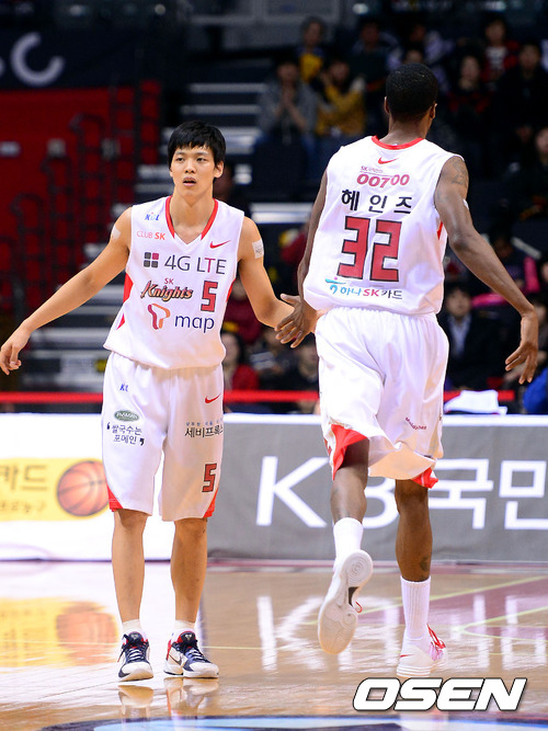 29일 오후 경기 고양체육관에서 열린 'KB 국민카드 2012-2013 프로농구' 고양 오리온스와 서울 SK의 경기, 4쿼터 SK 김선형이 역전 득점을 올리고 헤인즈와 하이파이브를 하고 있다.