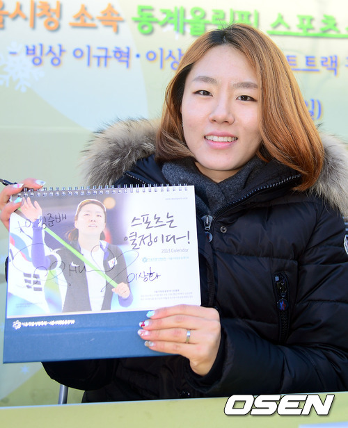 30일 서울광장 스케이트장에서 진행된 '서울시청 소속 동계올림픽 스포츠스타 팬 사인회'에서 이상화가 정성스럽게 사인한 달력을 들고 포토타임을 갖고 있다.
