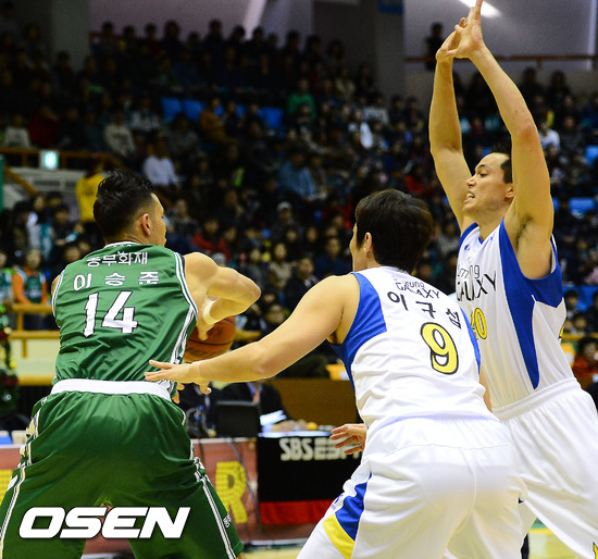 30일 오후 강원도 원주시 명륜동 원주 치악체육관에서 열린 KB 국민카드 2012-2013 프로농구 원주 동부 프로미와 서울 삼성 썬더스의 경기, 1쿼터 동부 이승준이 패스하려 할때 삼성 이동준이 블로킹을 시도하고 있다.