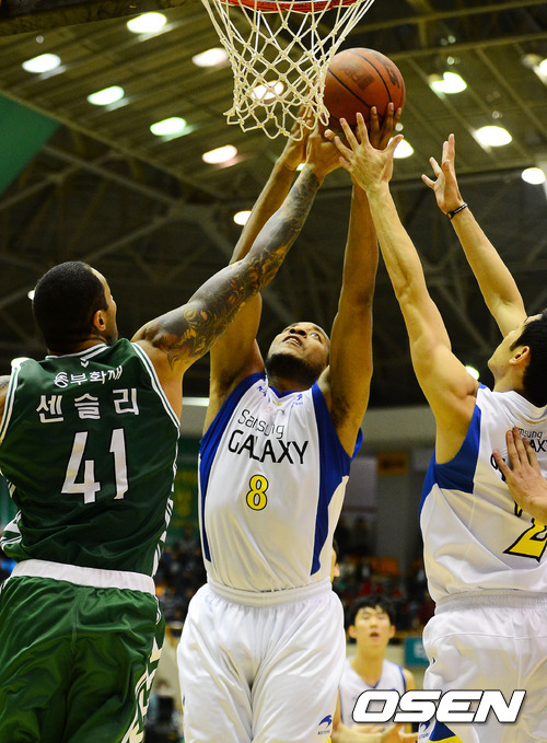 30일 오후 강원도 원주시 명륜동 원주 치악체육관에서 열린 KB 국민카드 2012-2013 프로농구 원주 동부 프로미와 서울 삼성 썬더스의 경기, 3쿼터 동부 센슬리와 삼성 타운스 이관희가 리바운드 다툼을 하고 있다.