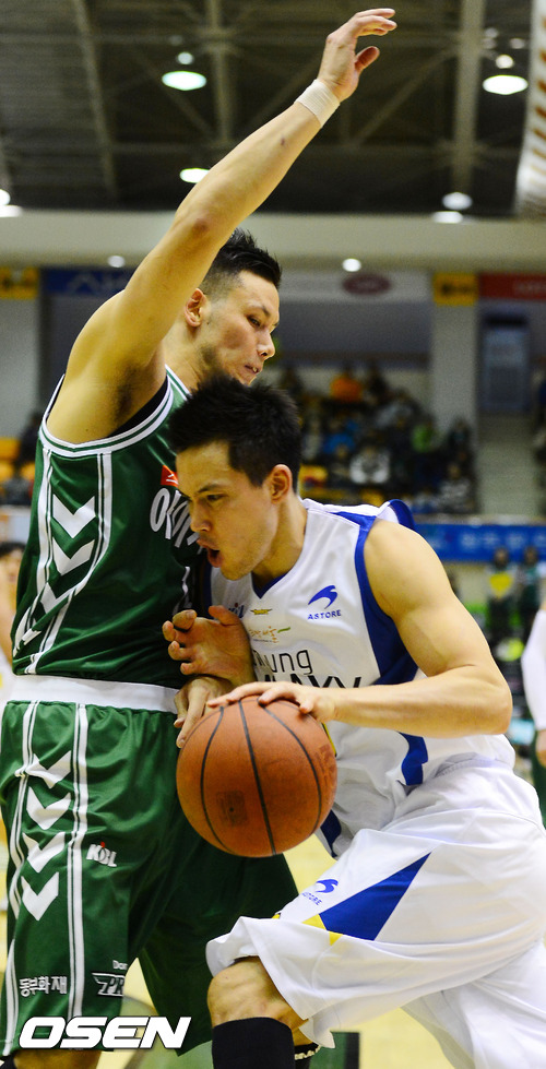 30일 오후 강원도 원주시 명륜동 원주 치악체육관에서 열린 KB 국민카드 2012-2013 프로농구 원주 동부 프로미와 서울 삼성 썬더스의 경기, 4쿼터 삼성 이동준이 동부 이승준을 밀치며 파고 들고 있다.