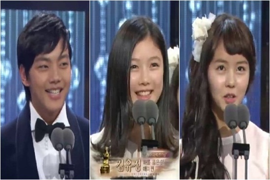 [OSEN=윤가이, 김경주 기자] 드라마 '해를 품은 달'의 여진구와 김유정, 김소현이 2012 MBC 연기대상 신인상을 수상했다.