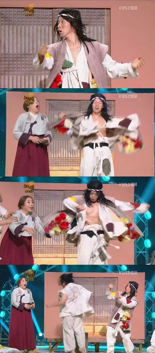 이어 허경환은 "나 꽃거지야"라고 말하며 선보이는 특유의 행동을 하면서 옷고름이 풀어져 의도하지 않게 식스팩이 공개, 웃음을 자아냈다.