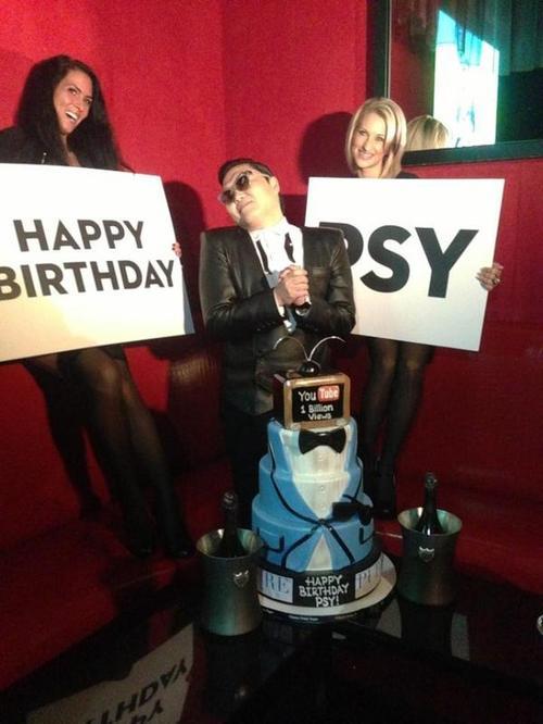 사진 속 싸이는 '생일 축하해요', '싸이'라고 쓰인 푯말을 든 두 명의 여성 가운데서 두 손을 모은 채 기쁨을 표현하고 있다. 그의 앞에는 '강남스타일'의 무대의상을 입은 싸이와 꼭 같은 모양의 케이크가 놓여있다. 싸이 특유의 유쾌하고 코믹한 캐릭터가 드러나는 모습이다.