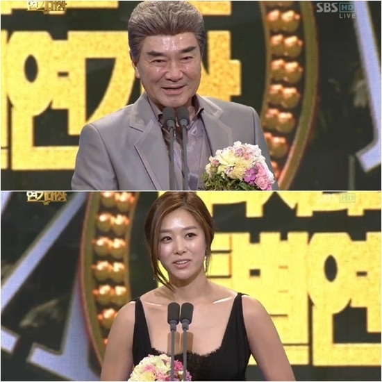 배우 이덕화와 장신영이 31일 마포구 상암동 SBS 프리즘타워에서 열린 2012 SBS '연기대상' 시상식에서 미니시리즈 부문 특별연기상을 수상했다.