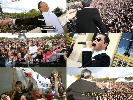 싸이는 31일 밤 방송된 2012 MBC 가요대제전에서 "그간의 기록을 담아둔 영상을 공개하겠다"며 에펠탑 플래시몹 모습이 담긴 영상을 공개했다.