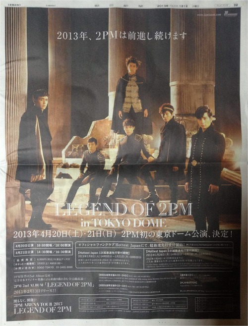 이 소식은 1일 현지 아사히 신문과 요미우리 신문 전면을 장식하기도 했다. 아사히 신문과 요미우리 신문은 마이니치 신문과 함께 일본 3대 신문으로 불리는 일간지로, 2PM은 첫 도쿄돔 콘서트 ‘레전드 오브 2PM 인 도쿄돔(LEGEND OF 2PM in TOKYO DOME)’ 소식과 새 앨범 ‘레전드 오브 2PM’의 발매소식으로 이들 신문에 실렸다.