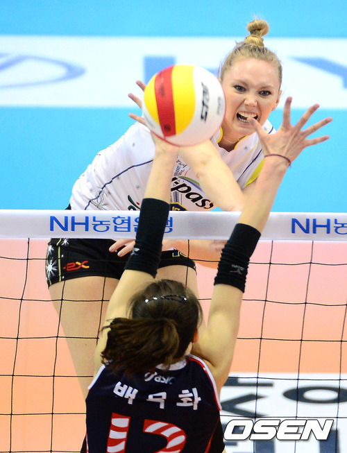 1일 오후 대전 충무체육관에서 열린 '2012-2013 NH농협 V-리그' 여자부 KGC인삼공사와 도로공사의 경기, 1세트 도로공사 니콜이 인삼공사의 블로킹 벽을 피해 공격을 시도하고 있다.