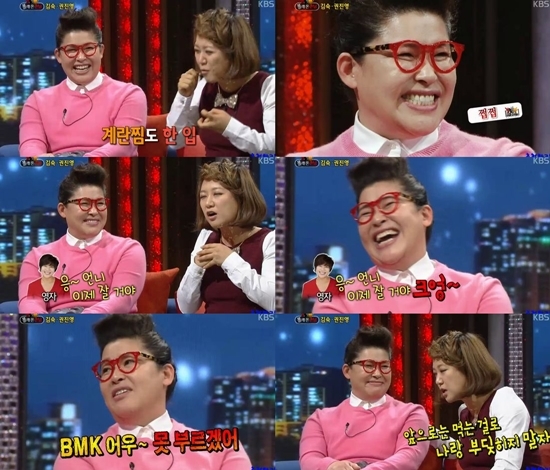 이날 이영자는 “손님들을 초대해 식사를 대접한 적이 있다. 그런데 BMK는 못 이기겠다. 앞으로 먹는 거로는 나랑 부딪히지 말자고 이야기했다”며 능청스럽게 말해 좌중을 폭소케 했다. 이에 김숙은 “이영자와 만나면 밥을 4차까지 먹는다. 차라리 술 먹는게 낫다”며 독특한 불만을 늘어놓기도 했다.