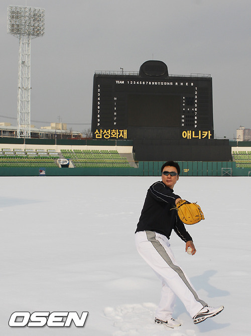 11월 10일 차이나 스타즈와의 아시아 시리즈 예선 2차전이 끝난 뒤 재충전에 돌입했던 이승엽은 1일 담금질에 나섰다. 왼손 중지 통증 회복을 위해 예년보다 방망이를 늦게 잡기로 한 이승엽은 이날부터 가벼운 티배팅을 시작할 계획이었다. 가는 날이 장날이라 했던가. 이날 대구구장에는 하얀 눈이 소복이 쌓여 있었다.