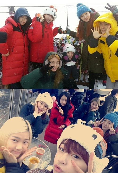 공개된 사진에는 타히티 멤버들이 남산에 올라 눈보라를 맞으며 소원 자물쇠를 달고 깜찍한 포즈로 취하고 있는 모습이 담겼다.