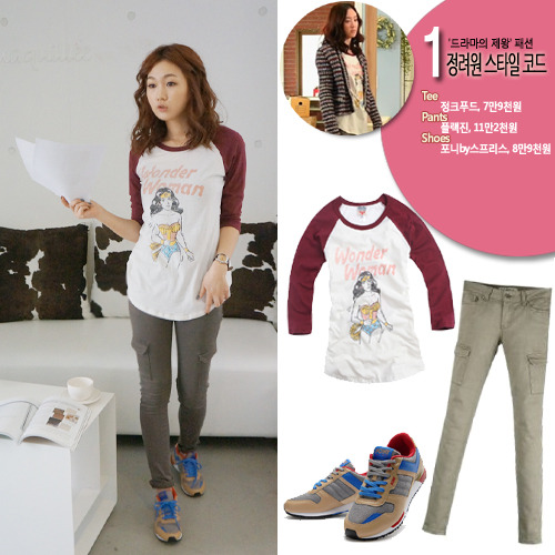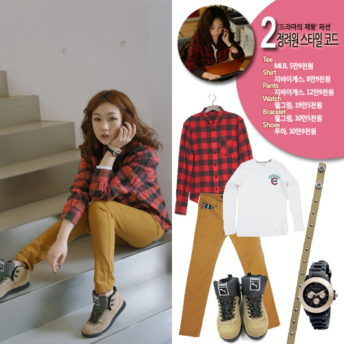 정려원은 캐나디안 워크셔츠와 마찬가지로 셔츠와 스트레이트 팬츠차림으로 격식을 갖춘 느낌을 주지만, 그 속에 받쳐 입은 그래픽 티셔츠와 컬러 운동화 매치로 경쾌하고 캐주얼한 분위기를 더한다.