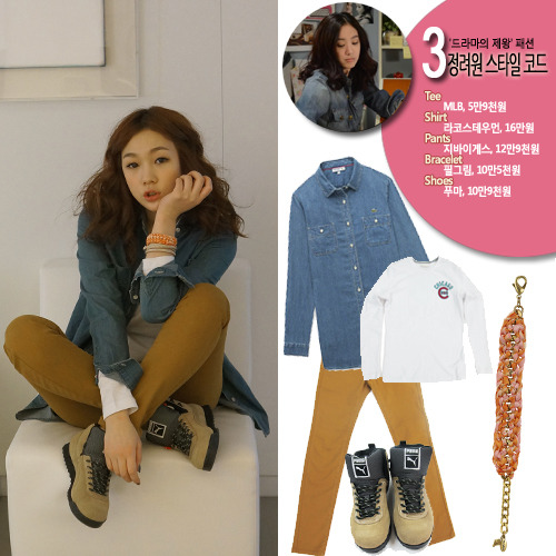 간절기에 등장하는 데님셔츠 역시 정려원의 잇 아이템. 정려원의 데님은 미국 해군의 함상용 작업복으로 사용했던 6~8온스 얇은 데님으로 만든, 장식이 제한된 웨스턴 셔츠의 느낌을 준다. 마치 현대적인 감성이 더해진 시티 웨스턴 스타일을 보는 듯하다.