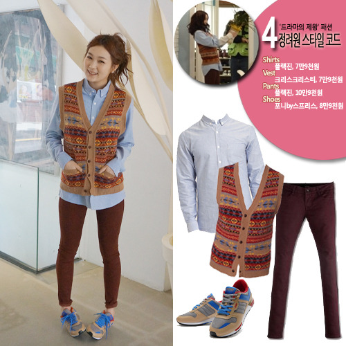 지난 방송에서 정려원은 인디고 블루셔츠와 진에 겨울 느낌이 나는 댄디 베스트를 매치하며 새로운 오피스 룩의 트렌드를 예고했다. 댄디 베스트란 앞트임식의 니트 베스트를 속칭한다.