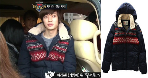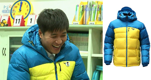 김종민은 KBS2 예능 ‘해피선데이-1박2일 시즌2’에서 P브랜드의 패딩을 입고 등장했다. 이 제품은 블루와 네온 옐로우 컬러가 배색되어있는 것이 특징으로 시선을 확 사로잡기 좋은 아이템이다.