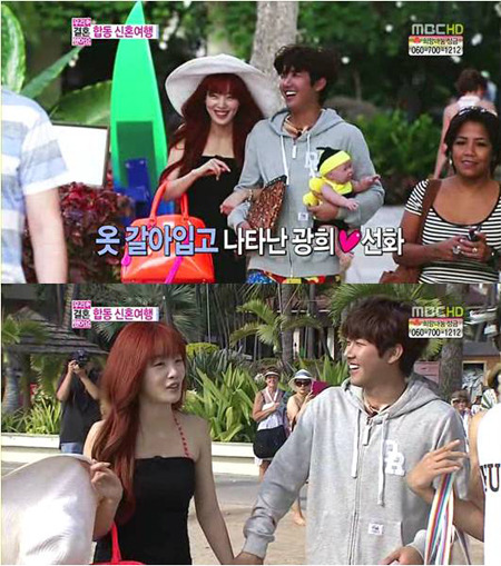 합동 신혼여행에서 해변을 찾은 세 커플들은 패션 대결로 그 재미를 더했다. 그 중에서도 단연 돋보이는 선화, 광희 커플의 패션 콘셉트는 ‘할리우드 비치 패션’이다. 선화는 블랙 튜브 톱 미니 원피스와 비키니를 레이어드 하고, 화이트 와이드 챙 모자로 해변 분위기를 냈다.