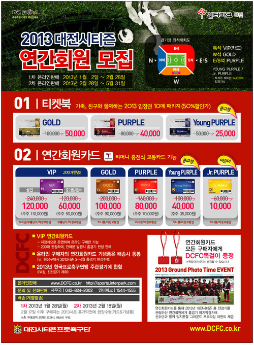 대전의 2013시즌 연간회원카드와 티켓북은 인터파크 대전 연간회원권 구입페이지를 통해 구입할 수 있다. 문의는 대전 홈페이지와 사무국(042-824-2002)로 하면 된다.