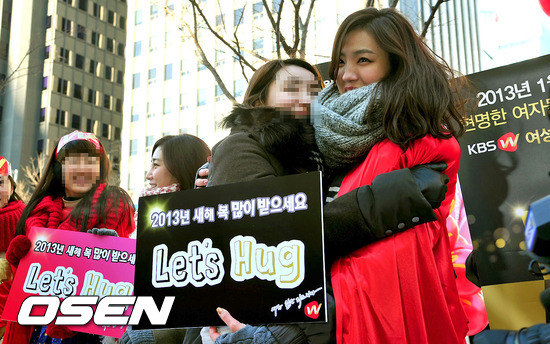 정인영 아나운서가 한 팬과 프리허그를 하고 있다