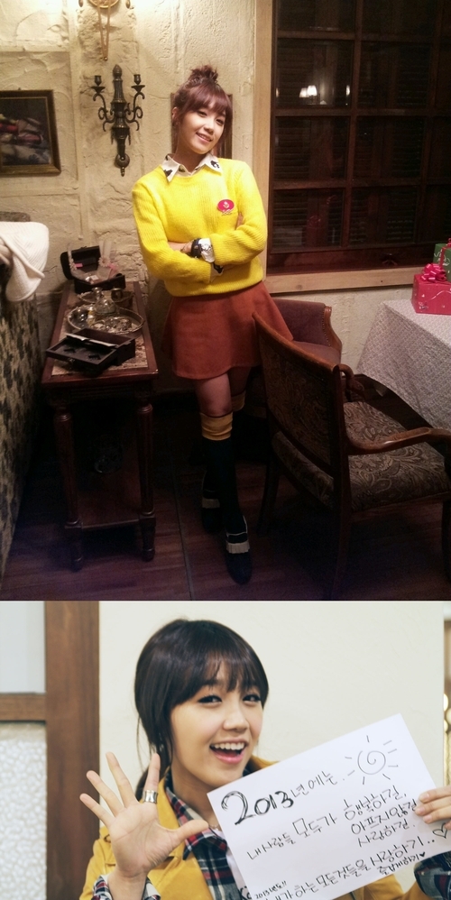 사진 속 정은지는 노란색의 환한 스웨터와 발랄한 미니스커트 차림으로 카메라 앞에 섰다. 특유의 상큼한 매력이 돋보이는 모습이다. 두 번째 올린 사진 속에서 그는 '2013년에는 내 사람들 모두가 행복하길, 아프지 않길, 사랑하길. 2013년도 내가 하는 모든 것들을 사랑하기. 즐겁게 하기'라고 쓴 새해 소망 문구를 든 채 포즈를 취하고 있다.