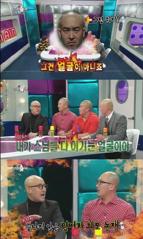 2일 오후 9시 55분 방송된 MBC '황금어장-라디오스타'는 2013년 신년 기획 해돋이 특집으로 진행돼 염경환, 홍석천, 윤성호, 숀리가 화려한 입담을 펼쳤다. 해돋이 특집인 만큼 이들의 헤어가 모두 민머리라 눈길을 끌었다.