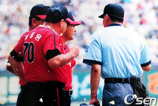 볼썽사나운 일이 그 대목에서 일어났다. 일부 몰지각한 관중들이 물병 따위를 그라운드로 마구 내던지는 가운데 3루 쪽의 한 관중이 먹다가 만 참외를 홈플레이트를 향해 날렸다. 참외는 ‘퍽’하는 둔탁한 파열음을 내면서 김응룡 감독의 뒷덜미를 강타했다.