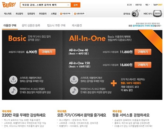 음악포털 벅스는 주력 상품으로 ‘베이직’, ‘올인원40’, ‘올인원150’을 선택했다. 모두 무제한 전곡 듣기(스트리밍)와 스마트폰에서 무제한 저장(캐싱)이 가능하다. 음악 듣기의 70% 이상이 PC에서 모바일로 옮겨간 현재 상황을 고려해 향후 주력을 스마트폰 전용 상품으로 삼겠다는 전략이다.