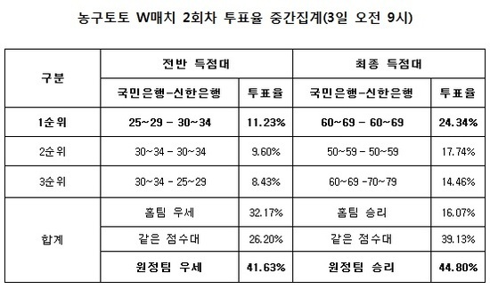 한편 후반전의 경우 국민은행 60~69점대-신한은행 60~69점대(24.34%), 국민은행 50~59점대-신한은행 50~59점대(17.74%), 국민은행 60~69점대-신한은행 70~79점대(14.46%)로 집계됐다.