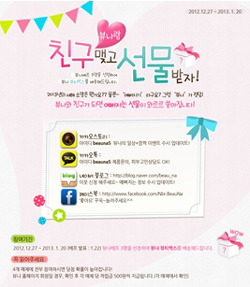 두 번째 이벤트는 카카오톡, 카카오 스토리, 페이스북, 공식 블로그 등과 친구를 맺거나 ‘좋아요’를 누르면 추첨을 통해 뷰나 베프 3명을 선정, 뷰나 뷰티박스를 증정한다.