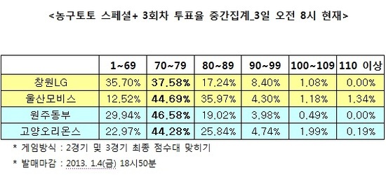 [농구토토] 국민체육진흥공단(www.kspo.or.kr)이 발행하는 체육진흥투표권 수탁사업자인 스포츠토토 공식 온라인 발매 사이트인 베트맨(www.betman.co.kr)은 오는 4일에 펼쳐지는 창원 LG-울산 모비스(1경기),원주 동부-고양 오리온스(2경기)전 등 한국프로농구(KBL) 2경기를 대상으로 한 농구토토 스페셜+ 3회차 투표율 중간집계 결과, 참가자들은 두 경기에서 모두 70점대 박빙승부가 벌어질 것으로 예상했다.