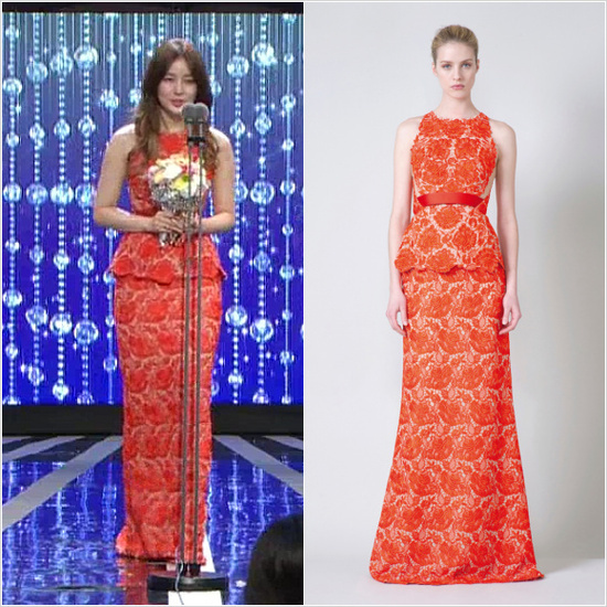 MBC 연기대상 시상식에 참석한 윤은혜는 스킨 컬러 바탕에 오렌지 컬러를 수놓은 화사하고 우아한 스텔라 맥카트니 드레스를 착용했다. 컬러만으로도 눈길이 가는 이 드레스는 언뜻 보면 맨 살 위에 레이스만을 걸친 듯한 착각을 하게 만든다.