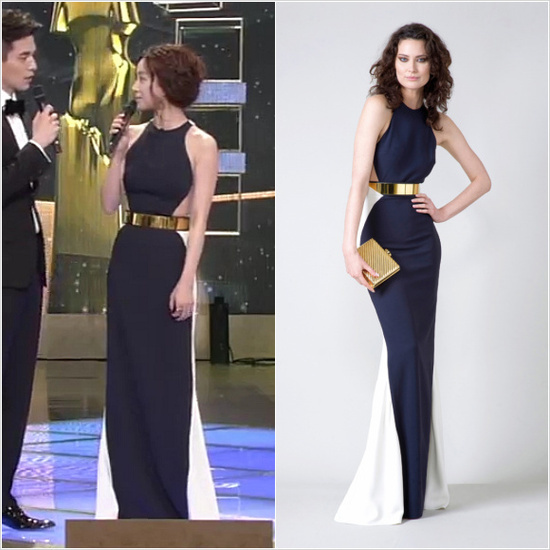 SBS 연기대상 MC를 맡은 정려원 또한 품격 있으면서도 아찔한 반전 드레스를 택했다. 네이비와 화이트 컬러가 적절히 매치된 이 드레스는 모던하면서도 시크한 분위기 속에 허리 옆선을 과감히 보여주는 반전이 숨어 있다. 과감한 골드 벨트가 섹시한 분위기를 더했다.