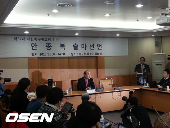 안 회장은 3일 종로구 신문로의 축구회관에서 기자회견을 열고 제52대 축구협회장 선거 출마를 공식 선언했다. 안 회장은 "한국 축구는 행정 실책과 프로축구 관중 감소, TV중계 외면 등으로 위기에 처해 있다"며 "현장의 목소리를 대변하고 한국 축구를 살리고자 이 자리에 섰다"고 출마의 변을 밝혔다.
