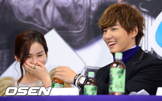 3일 오후 서울 논현동 임피리얼 팰리스 호텔에서 진행된 tvN의 새 월화드라마 '이웃집 꽃미남' 제작발표회에서 배우 윤시윤이 김윤혜에게 물을 건네고 있다