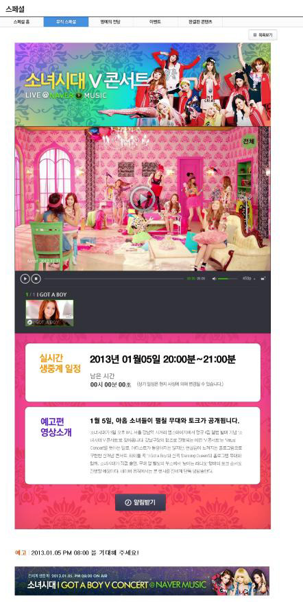 네이버는 이번 '소녀시대 V 콘서트'를 통해 소녀시대의 무대를 홀로그램으로 생생하게 구현한 공연 콘텐츠와 현장에서 진행되는 소녀시대 멤버들의 미니 토크쇼를 PC와 모바일로 전 세계에 생중계한다. 이번 '소녀시대 V CONCERT'는 네이버가 생중계하는 9번째 공연이다.