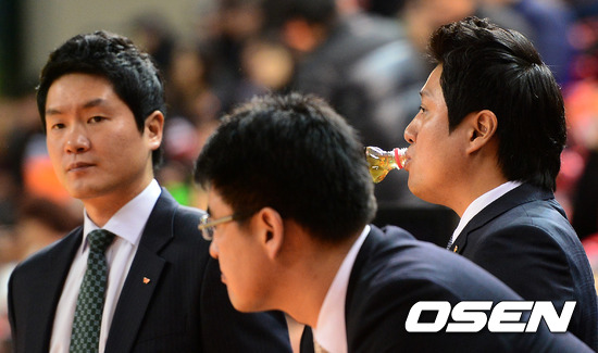경기에 앞서 SK 문경은 감독이 물을 마시고 있다.