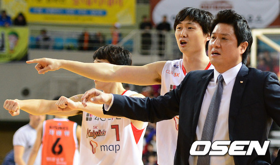 2쿼터 SK 문경은 감독과 선수들이 심판 판정에 불만을 나타내고 있다.