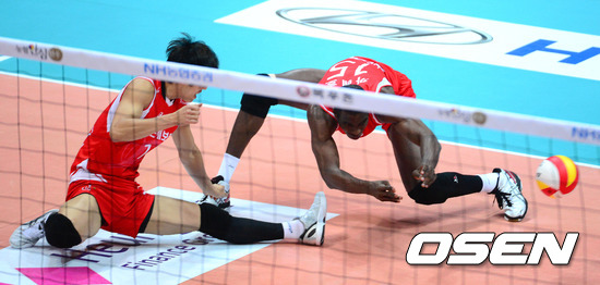 3일 오후 인천 도원체육관에서 열린 '2012-2013 NH농협 V-리그' 남자부 대한항공과 LIG손해보험의 경기, 1세트 LIG 주상용과 까메호가 대한항공의 공격을 놓치고 있다.
