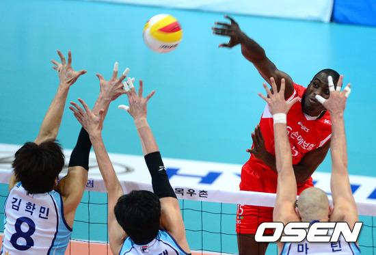 3일 오후 인천 도원체육관에서 열린 '2012-2013 NH농협 V-리그' 남자부 대한항공과 LIG손해보험의 경기, 1세트 LIG 까메호가 대한항공의 블로킹 벽을 피해 스파이크를 날리고 있다.