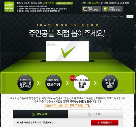 네오위즈인터넷(KOSDAQ 104200 대표 이기원)은 온라인음악방송 서비스 ‘세이캐스트(http://me.sayclub.com/saycast)’의 10주년 방송 대상을 실시한다고 4일 밝혔다.