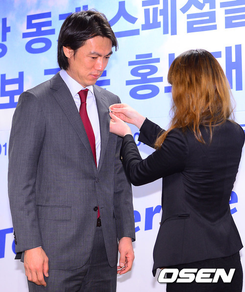 홍명보 전 감독이 평창 스페셜올림픽 배지를 달고 있다